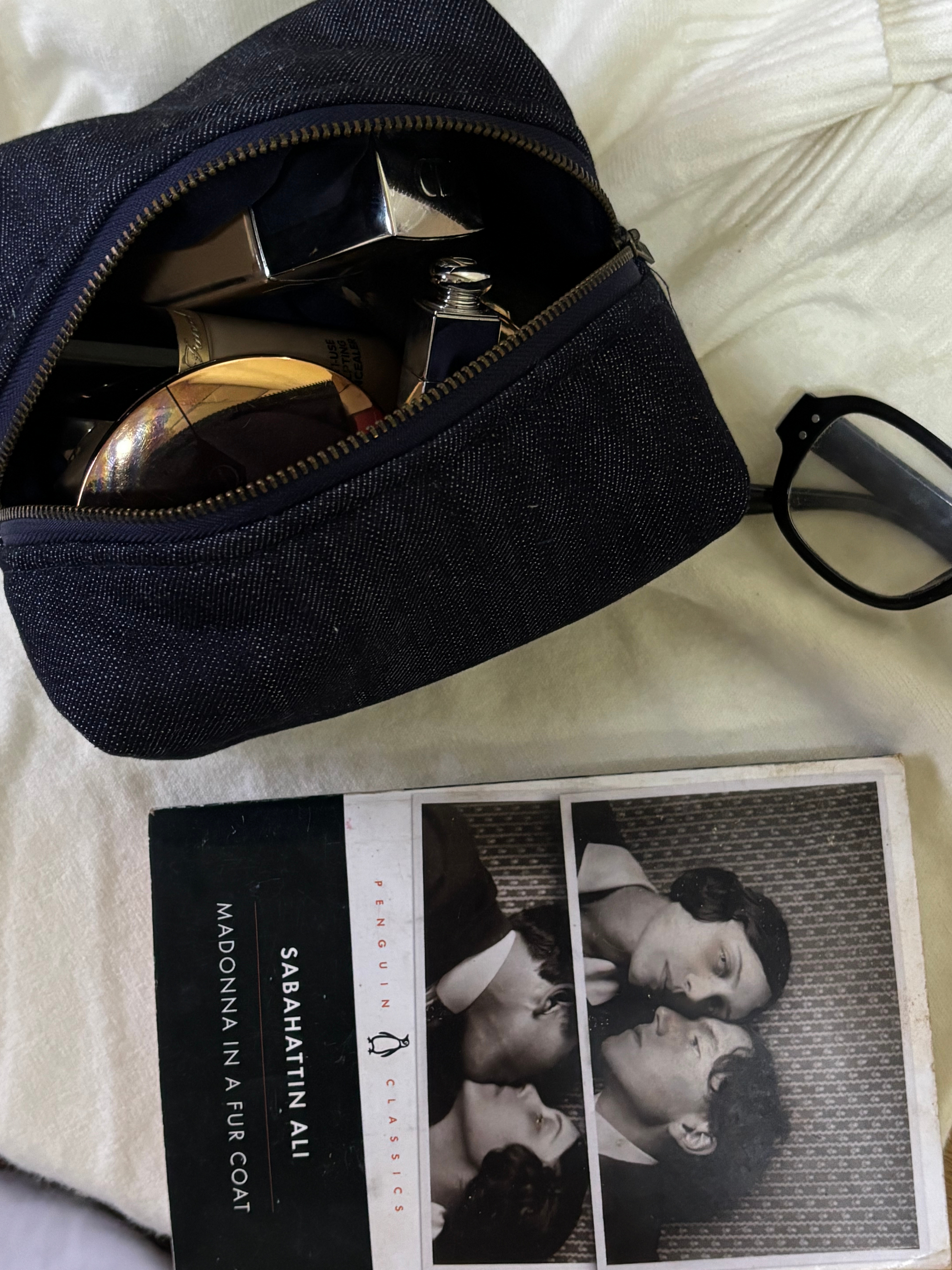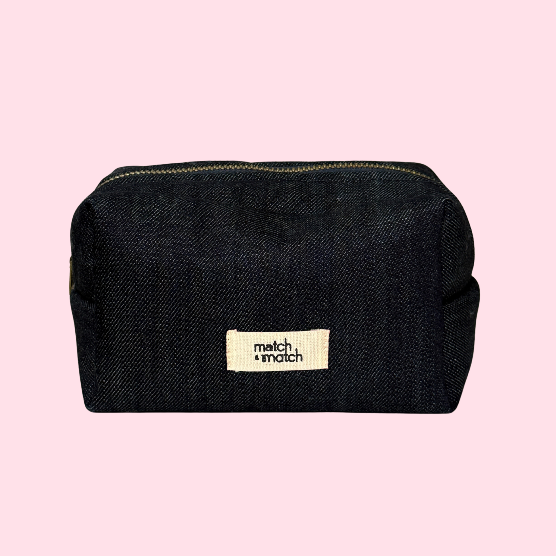The inner lining is a smooth navy blue fabric, while the outside is made of durable denim. To keep it looking its best, gently hand wash the denim with cold water and mild detergent. Avoid bleach to protect the fibers. Lay flat to dry to maintain its shape and texture. If needed, use low heat to carefully smooth any wrinkles, taking care not to damage the fabric. For a thorough clean, professional dry cleaning is recommended.
